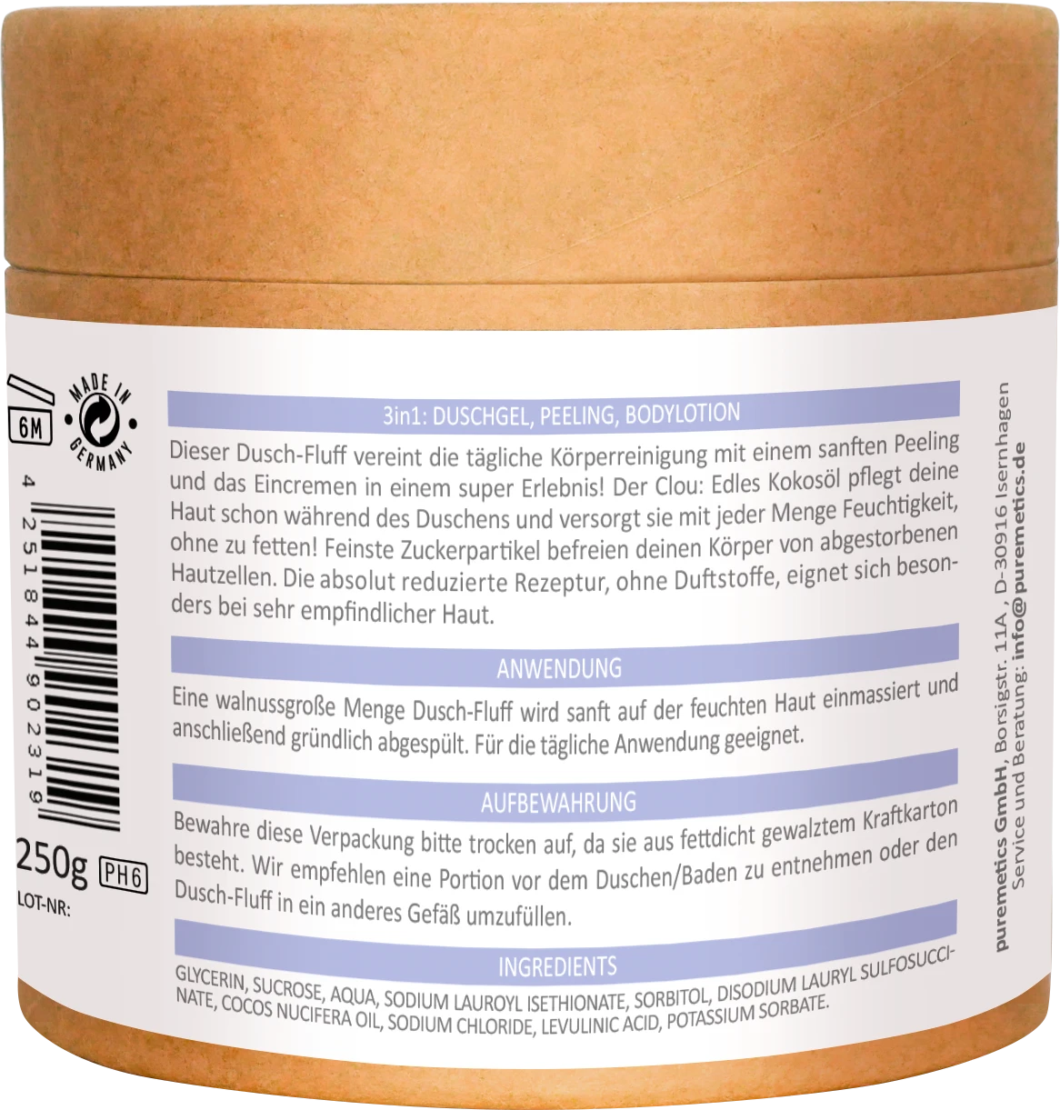 Am besten entnimmst du vor dem Duschen etwas Dusch-Fluff mit einem Löffel oder Schälchen für den Nassraum.