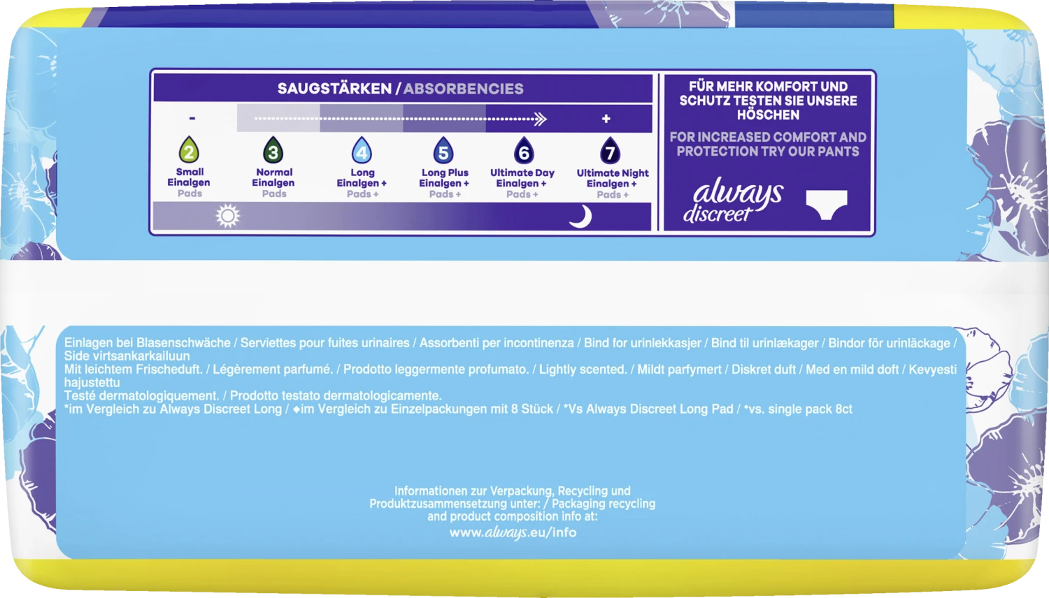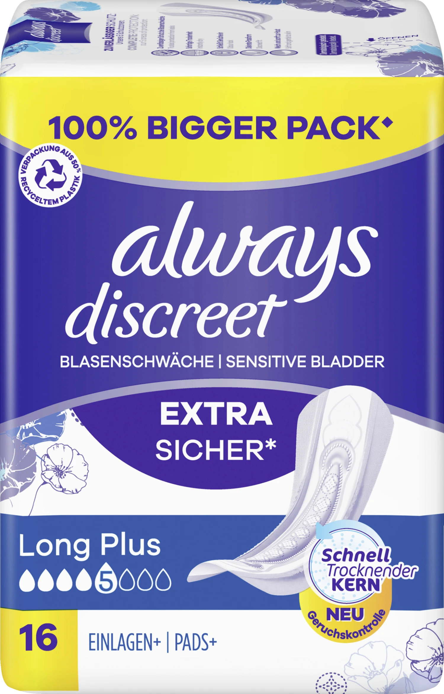 Ideal für stärkere Anforderungen. Always Discreet Inkontinenzeinlagen Long Plus bieten Extra Schutz. Sie wurden entwickelt, um Ihnen zusätzlichen Komfort und Saugfähigkeit zu bieten, damit Sie sich keine Sorgen mehr machen müssen. Ihre Struktur ermöglicht starken Schutz mit einem ultra-dünnen Kern, sodass Sie keine Kompromisse zwischen Komfort und Schutz eingehen müssen. Wenn Niesen oder Lachen Blasenschwäche verursacht, bieten die Always Discreet Einlagen Long Plus optimalen Schutz.
