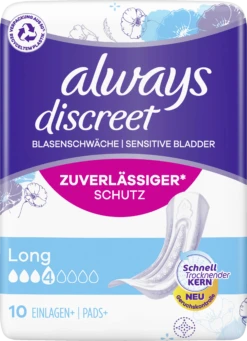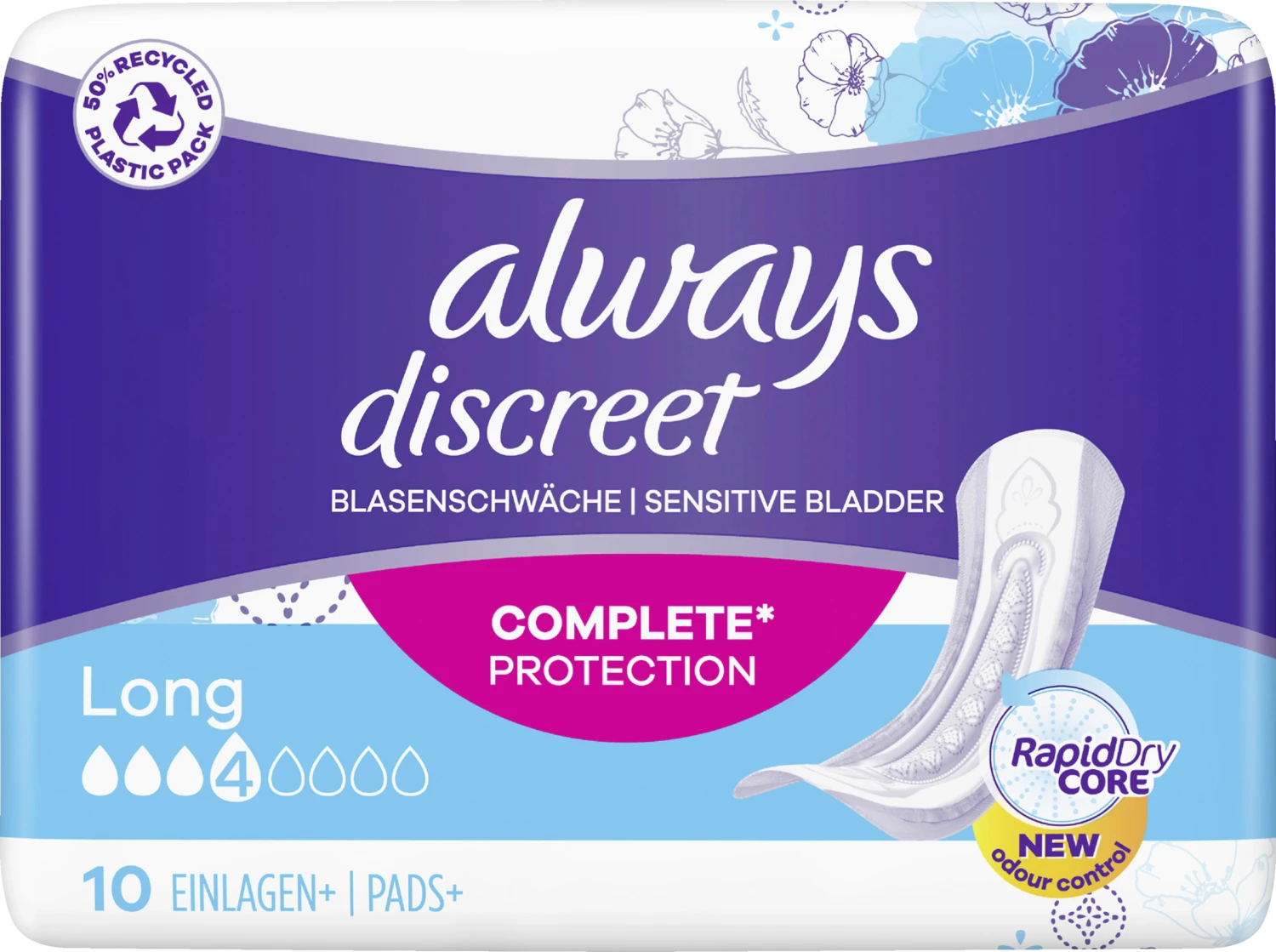 Die Always Discreet Inkontinenzeinlagen Long bieten Ihnen Rundumschutz und eine diskrete Passform. Jede Einlage ist so konzipiert, dass sie zuverlässigen Schutz vor Auslaufen,Geruchskontrolle, sofortiges Trocknen und ein weiches, sanftes Gefühl auf der Haut bietet, während sie sich diskret an Ihren Körper anpasst. Wenn Niesen oder Lachen zu Blasenschwäche führt, bieten die Always Discreet Einlagen Long einen starken Schutz und die gewünschte Diskretion, damit Sie sich sicher fühlen können.