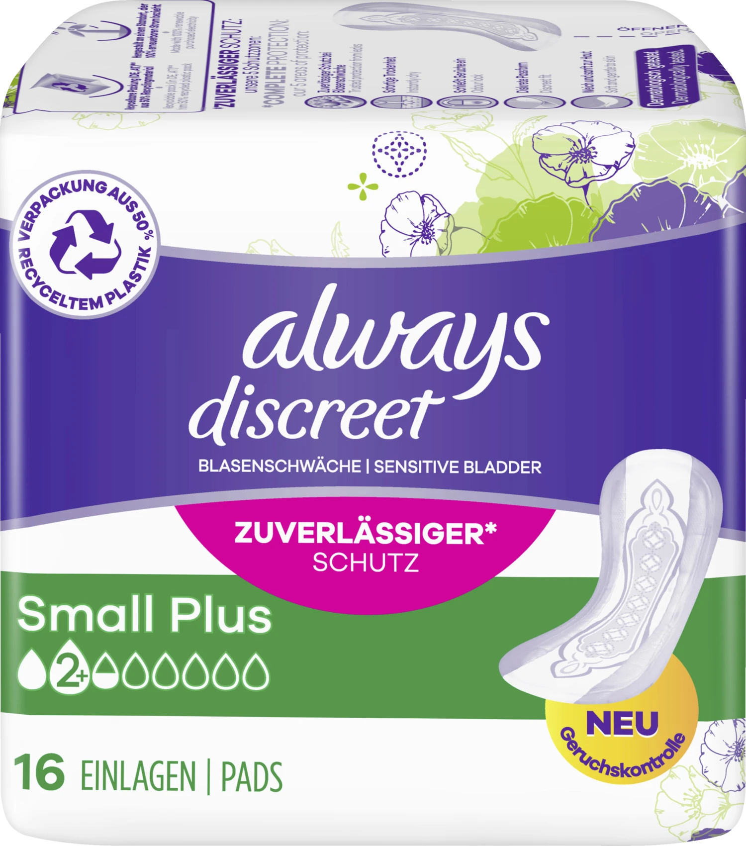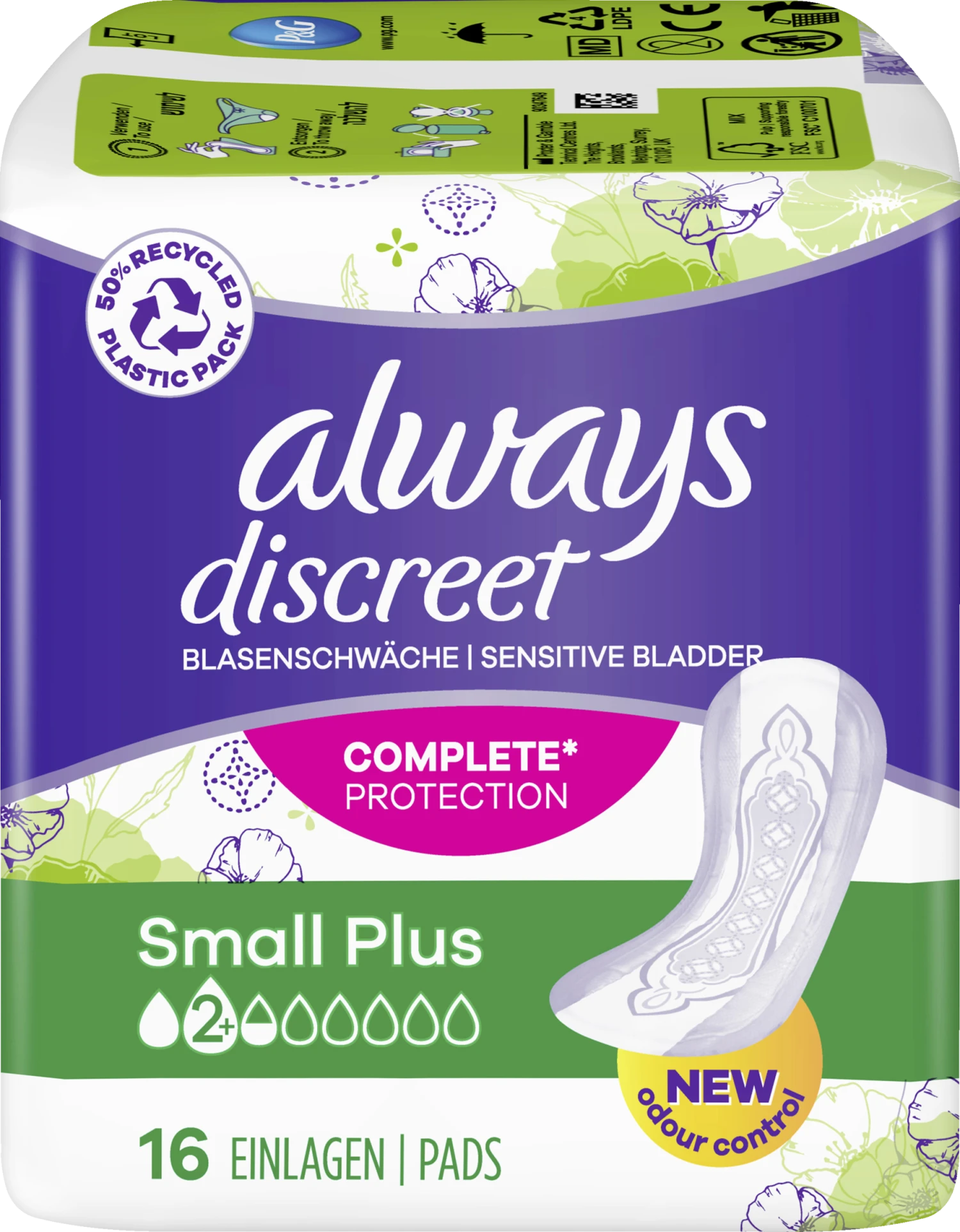 Die Always Discreet Inkontinenzeinlagen Small bieten Ihnen Rundumschutz und eine diskrete Passform. Jede Einlage ist so konzipiert, dass sie zuverlässigen Schutz vor Auslaufen, Geruchskontrolle, sofortiges Trocknen und ein weiches, sanftes Gefühl auf der Haut bietet, während sie sich diskret an Ihren Körper anpasst. Wenn Niesen oder Lachen zu Blasenschwäche führt, bieten die Always Discreet Einlagen Small einen starken Schutz und die gewünschte Diskretion, damit Sie sich sicher fühlen können.