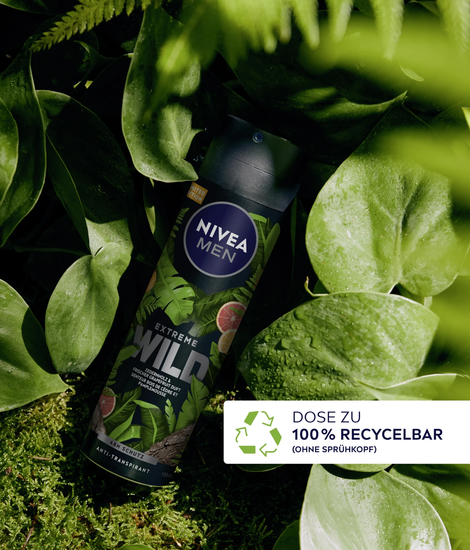 Entdecke deine wilde Seite – mit EXTREME WILD Zedernholz von NIVEA MEN. Das Deo Spray bietet zuverlässigen 48h Anti-Transpirant-Schutz und pflegt dabei deine Haut. Das Limited Edition Deo ist frei von Ethylalkohol und trocknet schnell auf deiner Haut. Der maskuline Duft nach Zedernholz & frischer Grapefruit erfrischt deine Haut und Sinne. Die Hautverträglichkeit ist dermatologisch bestätigt.