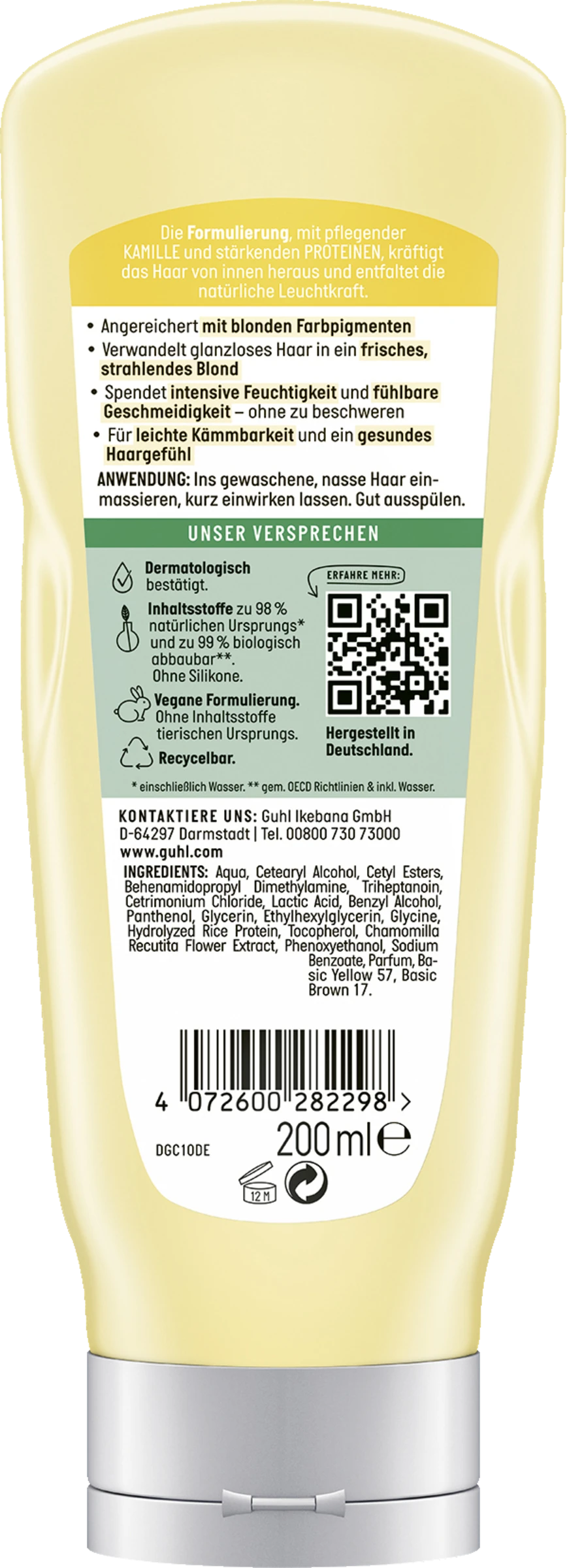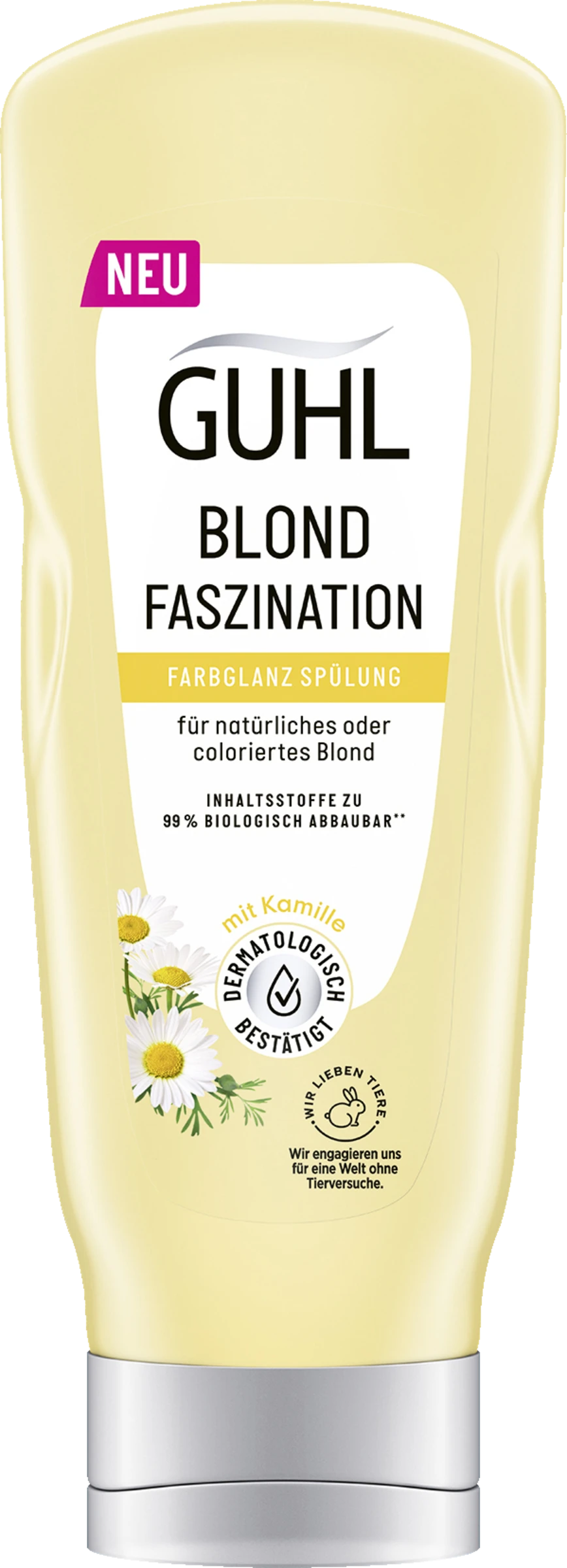 Guhl Blond Faszination – Die vegane Serie für blondes Haar. Mit der Blond Faszination Serie von Guhl liegen Sie für blondes Haar goldrichtig. Dank der neuen, durchdachten Formulierung mit pflegender Kamille und stärkenden Proteinen, sorgt die Serie nicht nur für strahlend schönes Blond, sondern auch für geschmeidiges Haar. Die Rezeptur ist vegan, wobei die Inhaltsstoffe nahezu komplett biologisch abbaubar sind. Die Verpackung, welche überwiegend aus recyceltem Material gefertigt wird, sowie das Shampoo werden in Deutschland hergestellt. Die Serie ist rundherum eine umweltfreundliche Wahl für Ihre Haare!, Echte Qualität, der du vertrauen kannst, so dass du deinen Wohlfühlmoment unbeschwert genießen kannst. Das ist Guhl. Seit über 75 Jahren nutzen sie ihre Expertise & Leidenschaft und kreieren hochwertige Haarpflegeprodukte, auf die du dich verlassen kannst. Guhl sorgt für sichtbar & spürbar gepflegtes Haar, ist dermatologisch bestätigt, PETA zertifiziert, enthält regionale Inhaltsstoffe und wird in Deutschland hergestellt! Augen zu, Musik an & genießen!