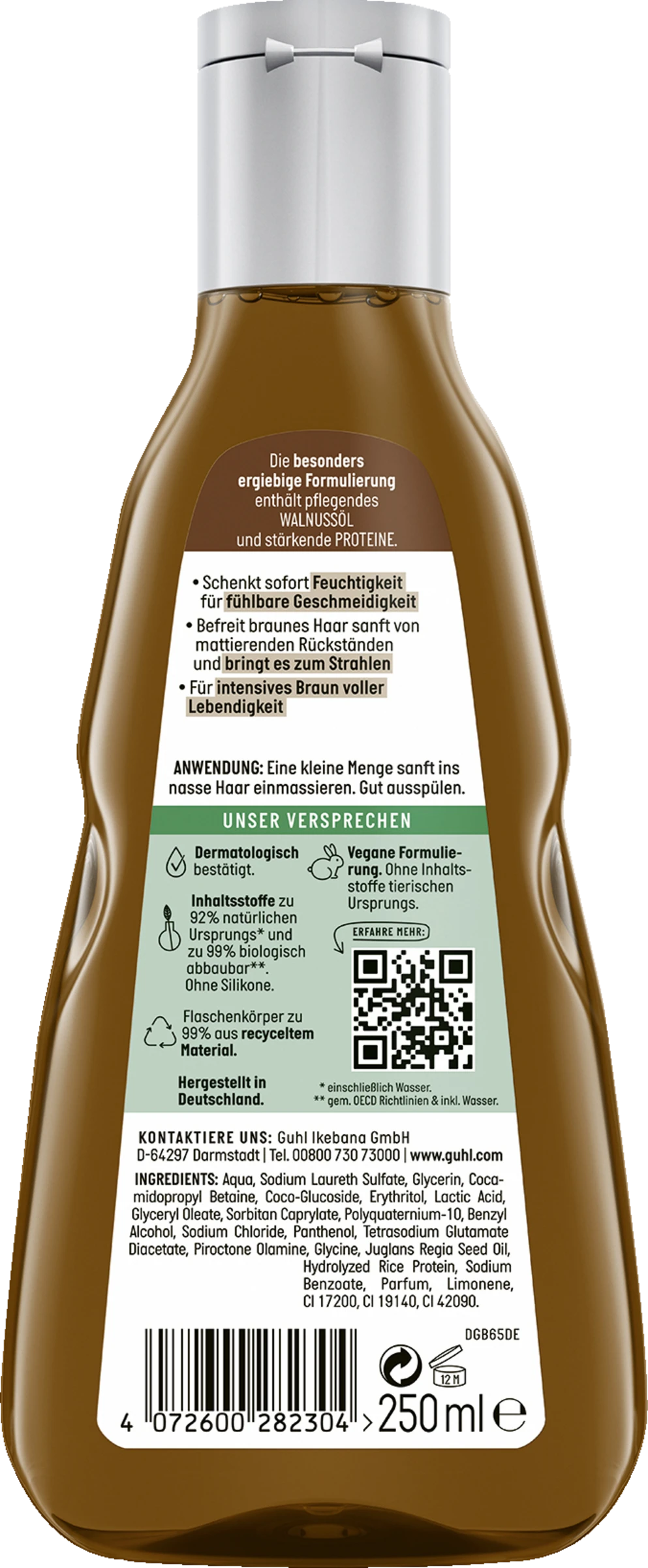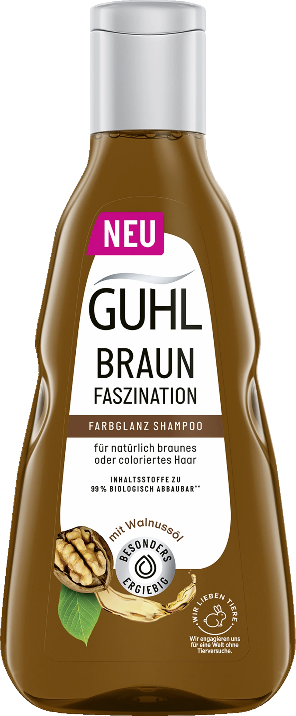 Guhl Braun Faszination – Die silikonfreie Serie für braunes Haar. Die Braun Faszination Serie ist eine Wohltat für Ihre Haare und gleichzeitig schonend zur Umwelt. Die neue Formulierung enthält überwiegend Inhaltsstoffe natürlichen Ursprungs. Neben dem pflegenden Walnussöl, welches braunes Haar zum Strahlen bringt, und stärkenden Proteinen sind nahezu alle Inhaltsstoffe biologisch abbaubar. Dabei sind alle Produkte der Serie besonders ergiebig. Zusätzlich überzeugt die umweltfreundliche Serie mit Ihrer veganen Formulierung und einem Flaschenkörper, der recycelbar ist. So geht nachhaltig!