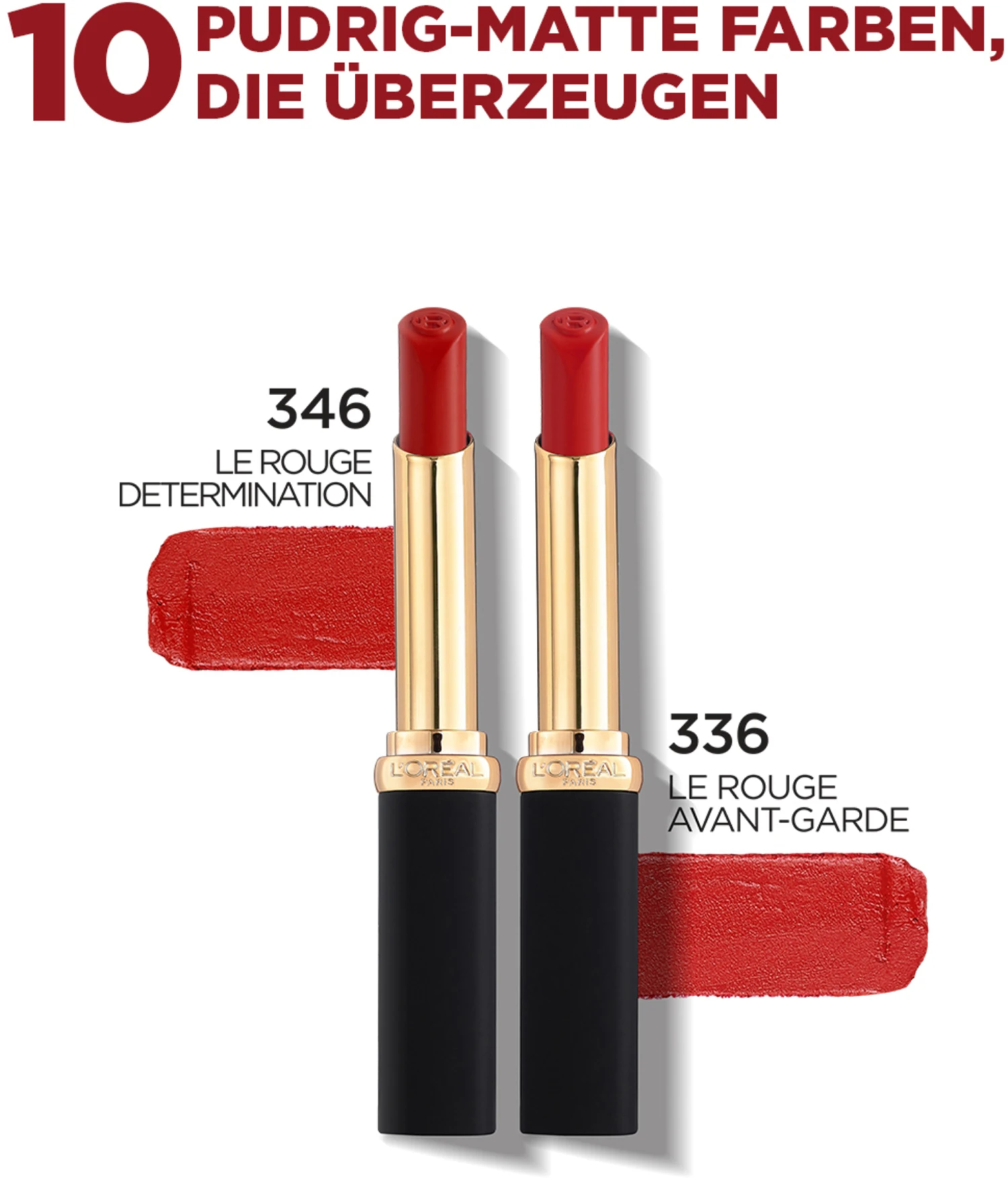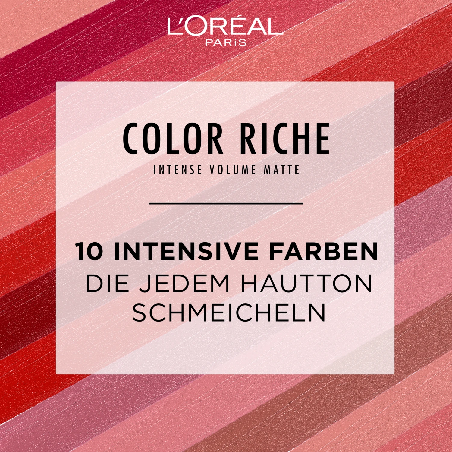 Der Color Riche Intense Volume Matte Lippenstift von L’Oréal Paris zaubert ein langanhaltendes pudrig-mattes Finish auf die Lippen. Die Formel mit Arganöl und Hyaluronsäure pflegt die Lippen, sorgt für ein angenehmes Tragegefühl und lässt die Lippen optisch voluminöser und voller aussehen. Die intensiv matte Farbe entsteht durch hochkonzentrierte Pigmente und bietet bis zu 16h mattierten Halt auf den Lippen, ohne zu verschmieren.