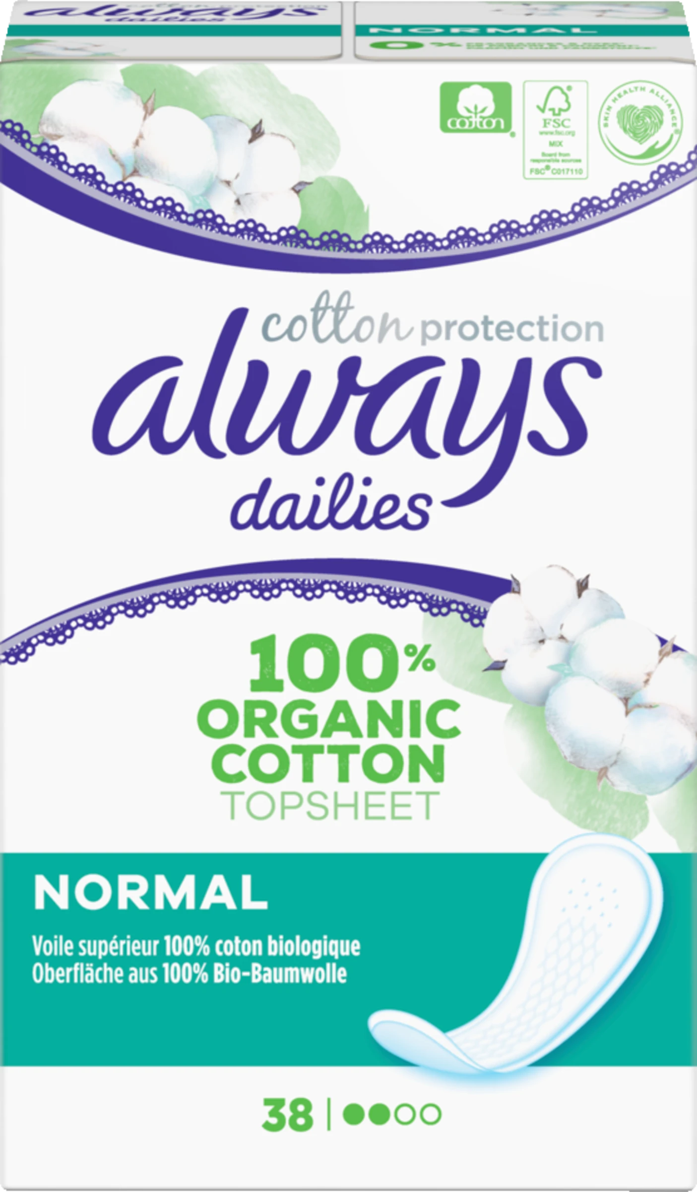 Die Oberfläche der Always Cotton Protection Slipeinlagen Normal besteht zu 100 % aus Bio-Baumwolle und enthalten weder Parfüm noch Duftstoffe. Sie sind dünn und flexibel, bequem zu tragen und atmungsaktiv. Die Hautverträglichkeit wurde von Dermatologen der Skin Health Alliance bestätigt und von Cotton Inc. zertifiziert.