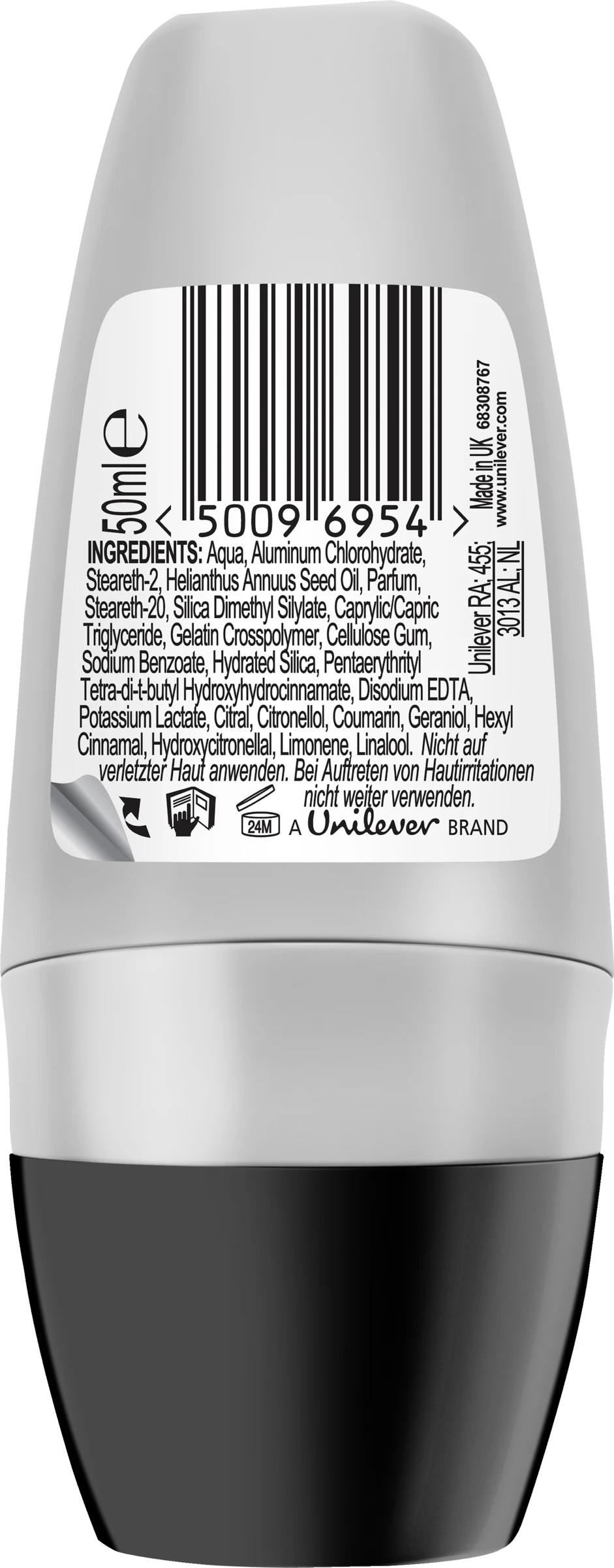 Aqua, Aluminum Chlorohydrate, Steareth-2, Helianthus Annuus Seed Oil, Parfum, Steareth-20, Silica Dimethyl Silyate, Caprylic/Capric Triglyceride, Gelatin Crosspolymer, Cellulose Gum, Sodium Benzoate, Hydrated Silicia, Disodium EDTA, Pentaerythityl Tetra-Di-T-Butyl Hydroxyhydrocinnamate, Potassium Lactate, Citronellol, Coumarin, Eugenol, Geraniol, Hexyl Cinnamal, Limonene, Linalool