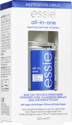 Der essie base & top coat all in one ist ein 3-in-1 Lack, welcher sowohl als Unterlack, Überlack als auch als Nagelhärter verwendet werden kann. Die Multifunktions-Formel mit Argan-Öl unterstützt dabei als Unterlack gepflegte und starke Nägel, während er als Überlack für wunderbar glatte Nägel mit hochglänzendem Finish sorgt. Die vegane Formel ohne Inhaltsstoffe tierischen Ursprungs schützt den Nagellack vor einem Absplittern und sorgt für einen besonders langen Halt. Für ein leichtes Auftragen verfügt der all-in-one-Lack von essie über einen Fächerpinsel, welcher sich der natürlichen Nagelform anpasst. Für ein perfektes Nail Finish mit dem Base Coat, Top Coat und Nagelhärter ein einem!