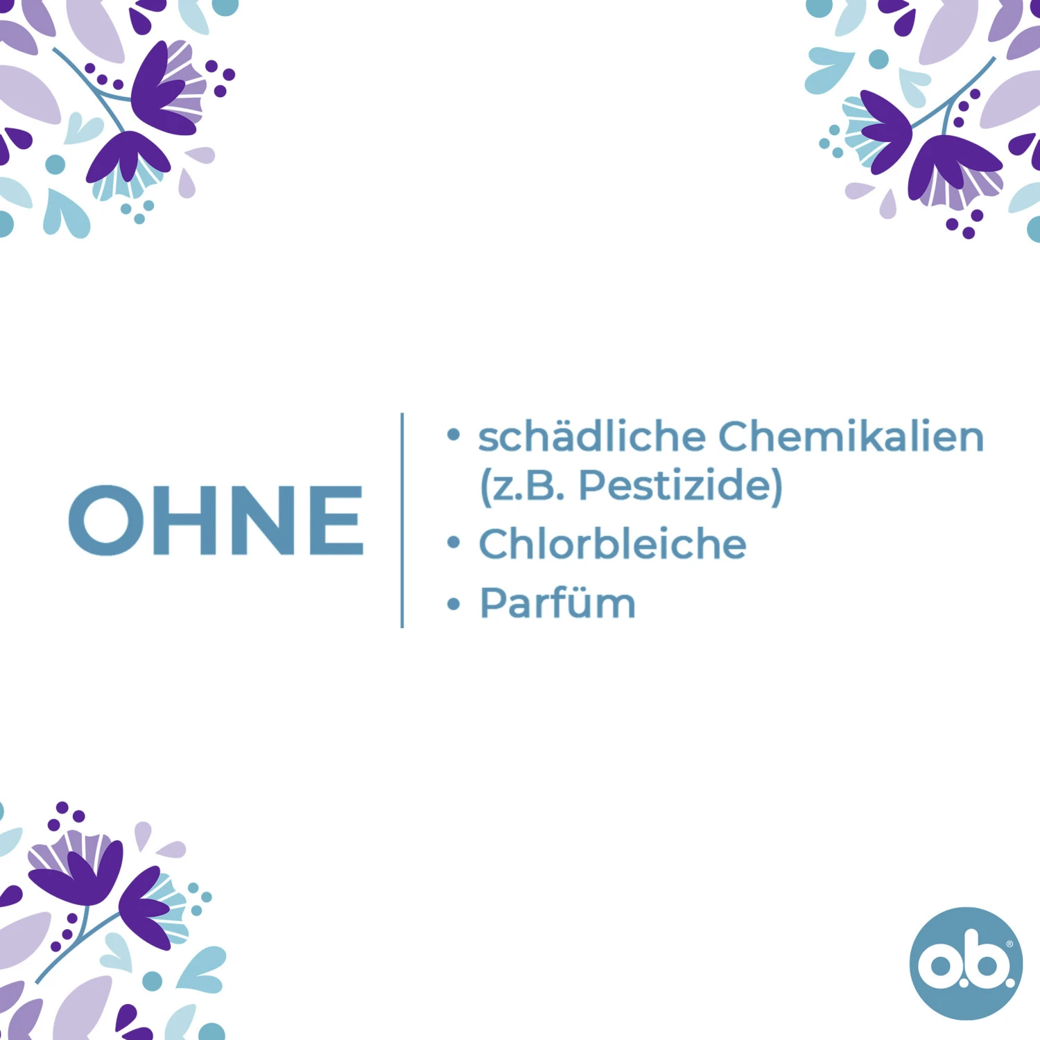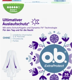 Die o.b. ExtraProtect Super+ Comfort Tampons für eine sehr starke Periode kombinieren 2 führende Tampontechnologien und bieten besonderen Auslaufschutz. Die extra Schutzflügel entfalten sich sanft, um Flüssigkeit aufzufangen, die bei gewöhnlichen Tampons vorbeilaufen kann. Die einzigartige Dynamic Fit™ Technologie mit ineinandergreifenden Rillen hilft die Flüssigkeit effizient im Inneren des Tampons zu verteilen. Zudem sind die Tampons gynäkologisch getestet, enthalten einen 100% pflanzlich basierten Tamponkern und sind frei von schädlichen Chemikalien (z.B. Pestizide), Chlorbleiche und Parfüm.