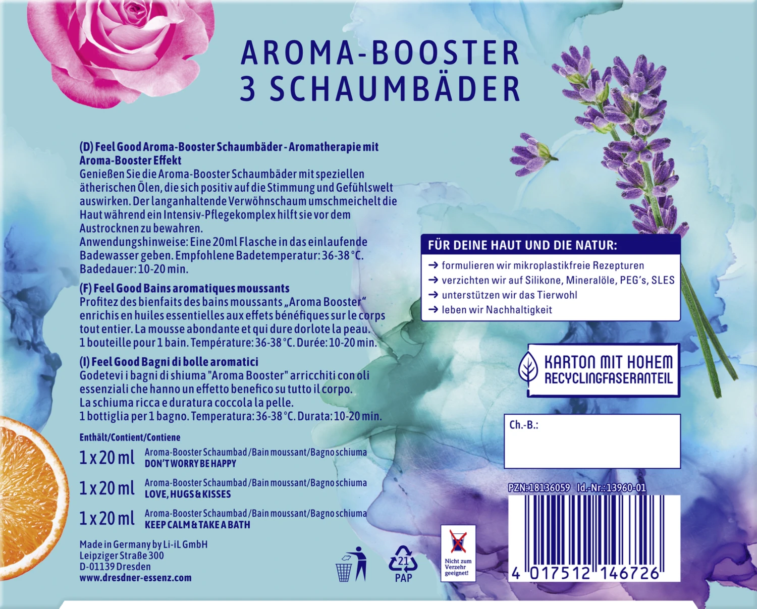 Schaumbad Love, Hugs and Kisses: Aqua, Sodium Coco-Sulfate, Cocamidopropyl Betaine, Parfum, Citrus Aurantium Dulcis Peel Oil, Cananga Odorata Flower Oil, Prunus Amygdalus Dulcis Oil, Hibiscus Sabdariffa Flower Extract, Rosa Centifolia Flower Extract, Glycerin, Cocamide MIPA, Sodium Chloride, Citric Acid, Sodium Benzoate, Denatonium Benzoate, Sodium Citrate, Sodium Carbonate, Sodium Sulfate, Benzyl Alcohol, Benzyl Salicylate, Linalool, Hexyl Cinnamal, Limonene, CI 16255.