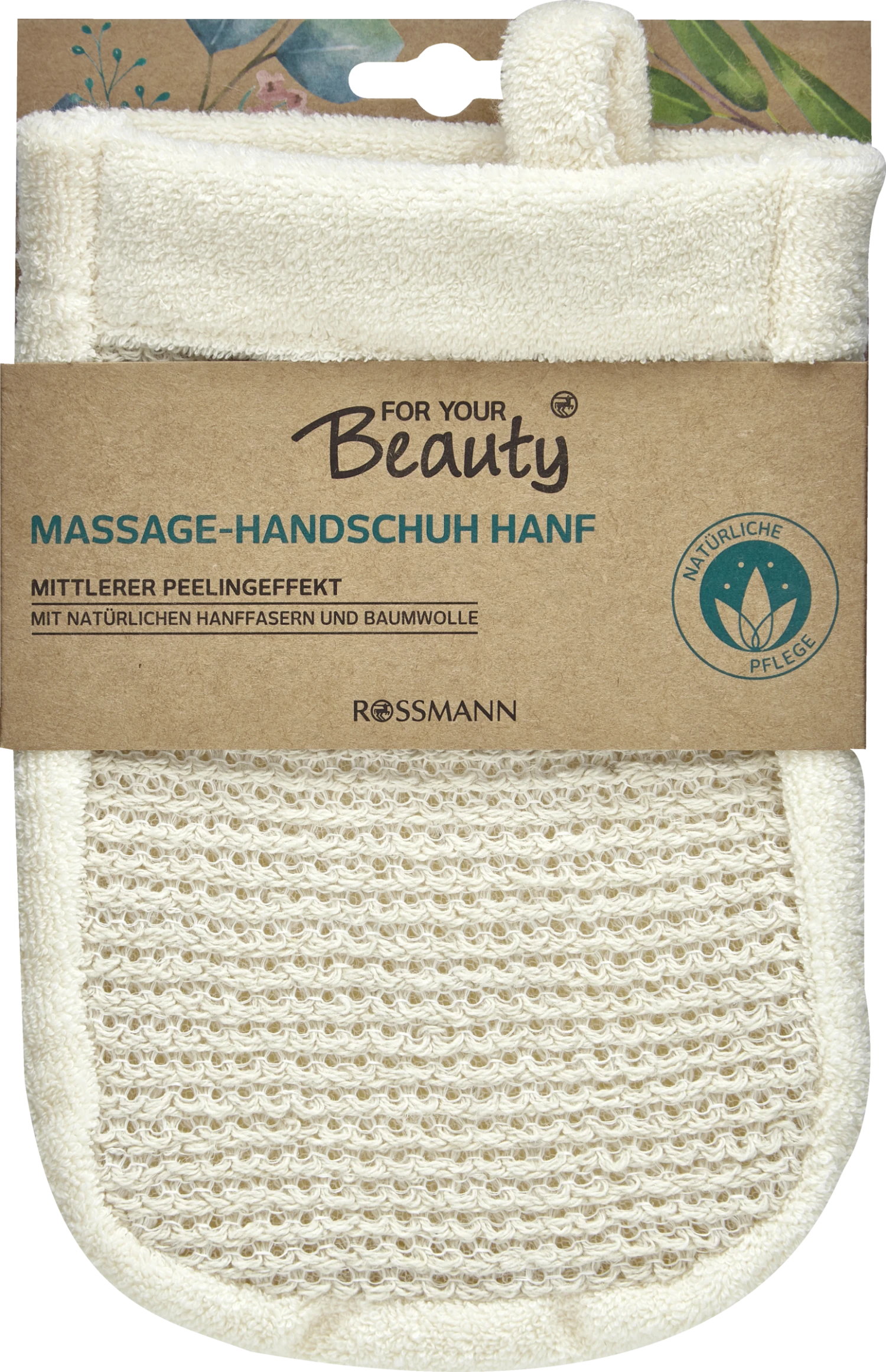 Der for your Beauty Massage-Handschuh mit Hanffasern, zeichnet sich durch zwei unterschiedliche Materialseiten aus. Die gröbere Peelingseite besteht zu 100% aus Hanffasern, diese peelt Ihre Haut wohltuend und entfernt sanft abgestorbene Hautschüppchen. Die weichere Rückseite besteht zu 90% aus Baumwolle und dient zur sanften Reinigung Ihrer Haut. Dank der Handschuhanwendung kann die Intensität des Peeling und der Massage ideal auf die eigenen Bedürfnisse angepasst werden.