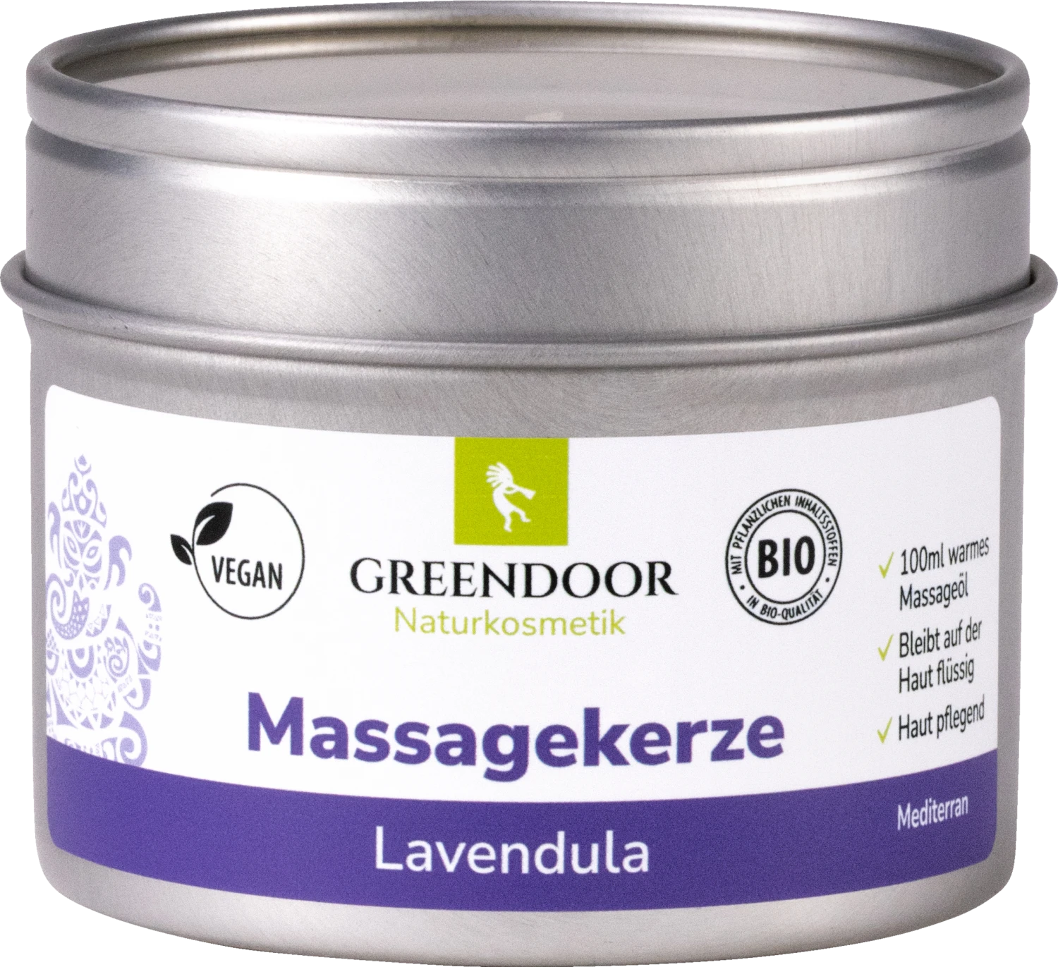 Mit dem warmen Wachs der GREENDOOR Massagekerze Lavendula zum außergewöhnlichen Massageerlebnis dank der wertvollen Öle und dem natürlichen Greendoor Rezepturgeheimnis. Nach 10-15 Minuten Zeit ist genug Wachs für eine Massage geschmolzen. Kerze löschen und das flüssige Wachs in die Handfläche gießen. Das Wachs einer GREENDOOR Massagekerze ist nur so warm, wie ein heißes Bad. Los geht’s mit der Massage! Das natürliche GREENDOOR Rezepturgeheimnis sorgt dafür, dass das entstehende Massageöl auf der Haut nicht mehr fest wird und bei der Massage in die Haut einzieht. Lavendel aus der Barreme fördert die Entspannung und beruhigt bei Nervosität. Die Anwendung von warmen Ölen bei der Massage entspannt verhärtete Muskelpartien besonders gut