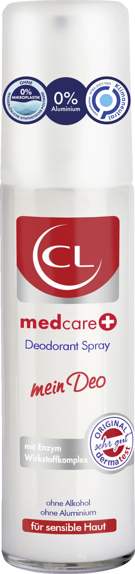 CL med care Deo Spray, aktiver Schutz und sanfte Pflege für die sensible Haut. Innovativer Wirkstoffkomplex auf Enzymbasis neutralisiert unerwünschten Köpergeruch.