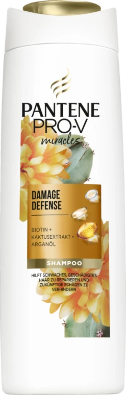 Jetzt die Pantene Pro-V Miracles Damage Defense Pflegeserie mit der intensiv nährenden Pro-V Rezeptur entdecken – Für Haare die ein Wunder brauchen! Die Damage Defense Pflegeserie vereint die Kraft der Pro-V Formel mit Biotin, Kaktusextrakt und Arganöl. Das Damage Defense Shampoo hilft schwaches, geschädigtes Haar zu reparieren und zukünftige Schäden zu verhindern. Für widerstandsfähiges, gesünder aussehendes Haar. Für beste Resultate zusammen mit den Produkten der Damage Defense Pflegeserie verwenden.