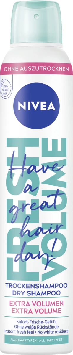 Nie wieder bad hair days! Das NIVEA Trockenshampoo Fresh Volume ist die perfekte Lösung: Es verleiht dem Haar extra Volumen & Griffigkeit und sorgt sofort nach der Anwendung für ein langanhaltendes Frischegefühl und einen angenehmen Duft. Ohne weiße Rückstände und ohne das Haar auszutrocknen.