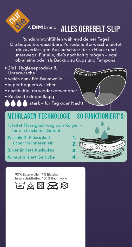 Alles geregelt Slip. Rundum wohlfühlen während deiner Tage? Die bequeme, waschbare Periodenunterwäsche bietet dir zuverlässigen Auslaufschutz für zu Hause und unterwegs. Für alle, die´s nachhaltig mögen – egal ob alleine oder als Backup zu Cups und Tampons.