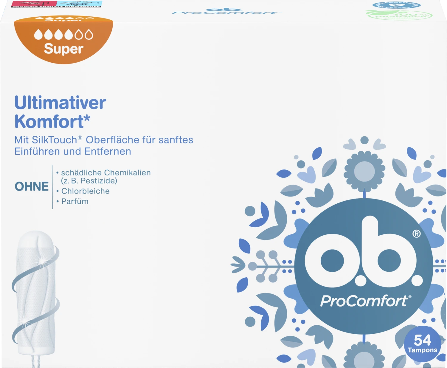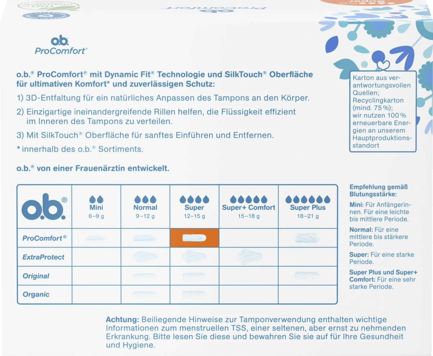 o.b. Tampons ProComfort Super mit Dynamic Fit™ Technologie und SilkTouch Oberfläche für ultimativen Komfort* und zuverlässigen Schutz. Die Dynamic Fit Technologie mit 3D Entfaltung sorgt für ein natürliches Anpassen des Tampons an den Körper und die einzigartigen ineinander greifenden Rillen helfen, die Flüssigkeit effizient im Inneren des Tampons zu verteilen. Mit SilkTouch Oberfläche für besonders leichtes Einführen und Entfernen. o.b. Tampons ProComfort Super eignen sich am besten für starke Tage. Da die Tampons einzeln verpackt sind, lassen sie sich ideal unterwegs mitnehmen. Die praktische Twist-Öffnung ermöglicht ein unkompliziertes, schnelles Öffnen.