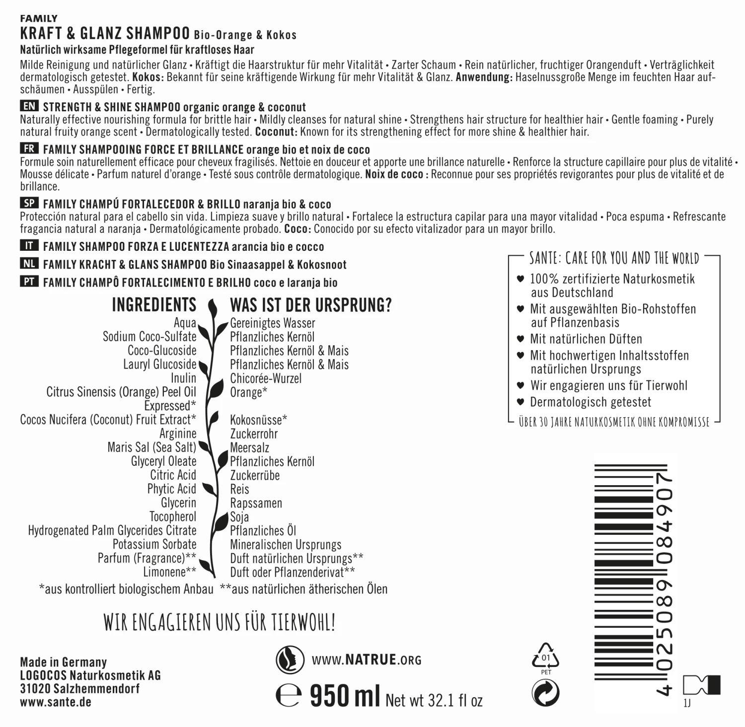 Das SANTE FAMILY Kraft & Glanz Shampoo mit Kokos für kraftloses Haar spendet neuen Glanz und stärkt die Haarstruktur. Die natürlich wirksame und milde Pflegeformel lässt das Haar vitalisierter wirken. Während der Haarwäsche entsteht ein zarter Schaum. Mit rein natürlichem, fruchtigem Orangenduft. Verträglichkeit dermatologisch getestet. Kokos: Bekannt für seine kräftigende Wirkung für mehr Vitalität & Glanz. Die Shampoo-Flasche in der Nachhaltigkeitsgröße mit 950ml Inhalt besteht aus 100% Recyclat.