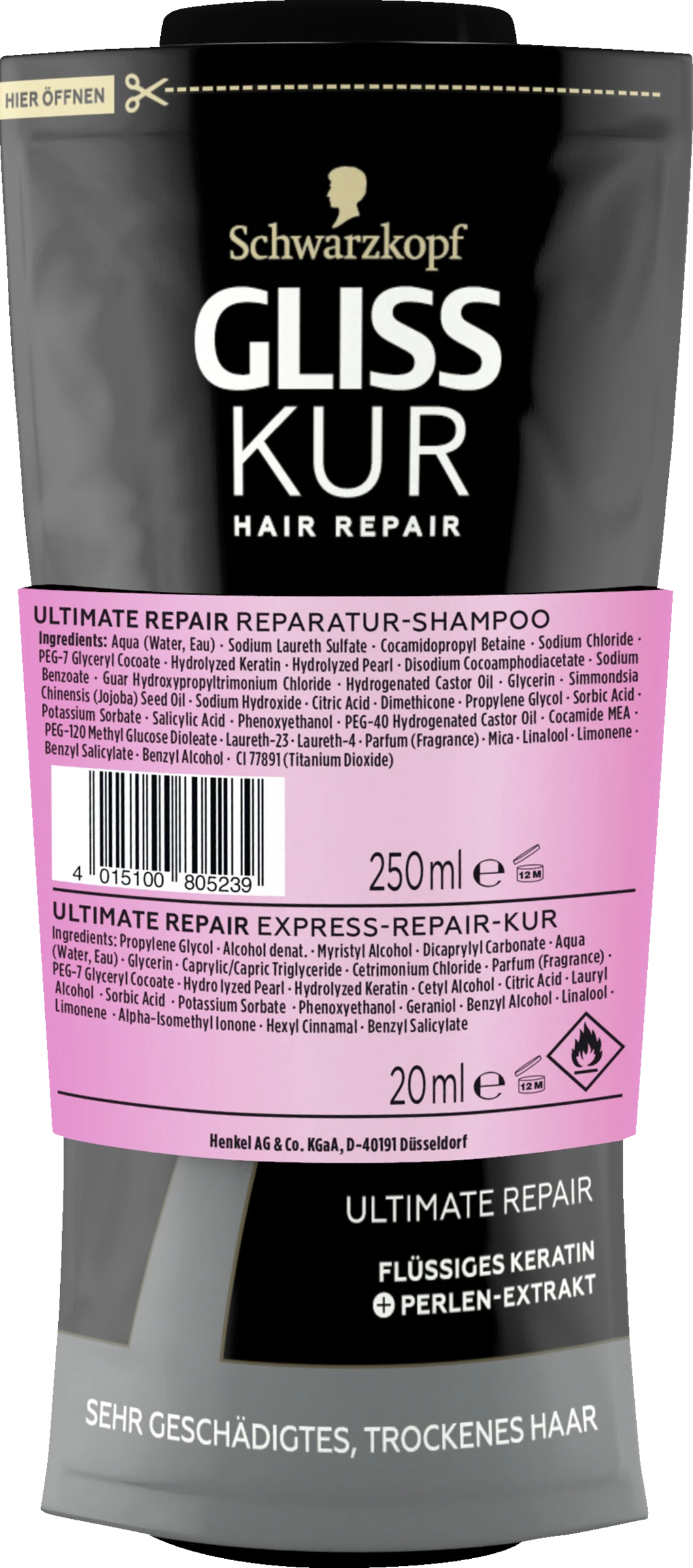 Ultimate Repair Reparatur-Shampoo: Aqua (Water, Eau), Sodium Laureth Sulfate, Cocamidopropyl Betaine, Sodium Chloride, PEG-7 Glyceryl Cocoate, Hydrolyzed Keratin, Hydrolyzed Pearl, Disodium Cocoamphodiacetate, Sodium Benzoate, Guar Hydroxypropyltrimonium Chloride, Hydrogenated Castor Oil, Glycerin, Simmondsia Chinensis (Jojoba) Seed Oil, Sodium Hydroxide, Citric Acid, Dimethicone, Propylene Glycol, Sorbic Acid, Potassium Sorbate, Salicylic Acid, Phenoxyethanol, PEG-40 Hydrogenated Castor Oil, Cocamide MEA, PEG-120 Methyl Glucose Dioleate, Laureth-23, Laureth-4, Parfum (Fragrance), Mica, Linalool, Limonene, Benzyl Salicylate, Benzyl Alcohol, CI 77891 (Titanium Dioxide)