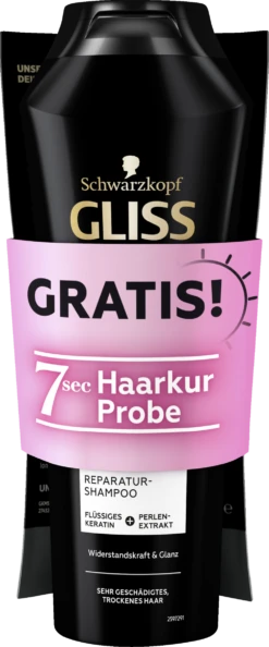 GLISS KUR Ultimate Repair Shampoo – Keratin Shampoo für stark geschädigtes Haar mit flüssigem Keratin Extrem geschädigtes Haar verliert Keratin, wodurch die Haarstruktur stark geschwächt wird. Das Haar braucht eine extreme Reparatur-Pflege, die den Keratinbestand wieder auffüllt. Das GLISS KUR Shampoo enthält flüssiges Keratin und Perlen-Extrakt, um Haarschäden zielgenau zu reparieren und den Keratinbestand wieder aufzufüllen. Bei Systemanwendung mit der Ultimate Repair Spülung verleiht das Repair Shampoo bis zu 90 % mehr Widerstandskraft und Glanz. Eine Kombination aus hochwertigen Haar-Aktivstoffen & Essenzen der Natur ist die Basis aller GLISS KUR Formeln. Sie sind auf die speziellen Bedürfnisse der Haare zugeschnitten und sorgen für Reparatur und eine sichtbar verbesserte Haarqualität. Die Produktvorteile im Detail: Shampoo für stark geschädigtes Haar Repariert Haarschäden und füllt den Keratinbestand wieder auf Mehr Widerstandskraft und Glanz* Mit flüssigem Keratin + Perlen-Extrakt Anwendung: Sanft im feuchten Haar verteilen. Gut ausspülen! Regelmäßig anwenden.*Bei Systemanwendung mit der Ultimate Repair Spülung ;Unsere Formelinnovation: Repariere dein Haar in nur 7 Sekunden. Effektiv wie eine 5-Minuten Kur in nur 7 Sekunden! Verwandelt sich bei Anwendung in eine cremige Textur, für glänzendes, repariertes Haar und das ohne Silikone.