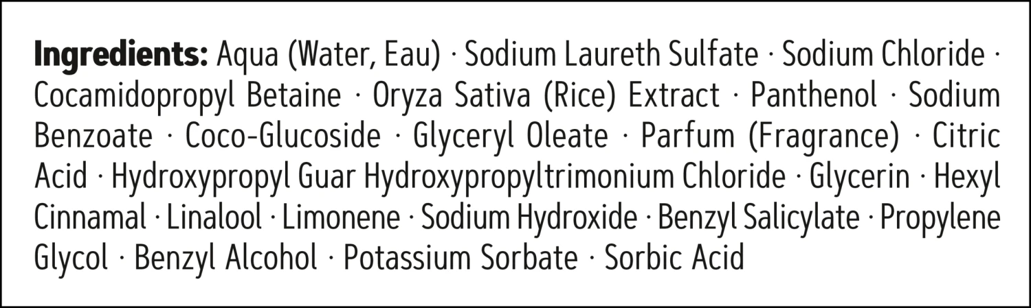 Aqua (Water, Eau), Sodium Laureth Sulfate, Sodium Chloride, Cocamidopropyl Betaine, Oryza Sativa (Rice) Extract, Panthenol, Sodium Benzoate, Coco-Glucoside, Glyceryl Oleate, Parfum (Fragrance), Citric Acid, Hydroxypropyl Guar Hydroxypropyltrimonium Chloride, Glycerin, Hexyl Cinnamal, Linalool, Limonene, Sodium Hydroxide, Benzyl Salicylate, Propylene Glycol, Benzyl Alcohol, Potassium Sorbate, Sorbic Acid