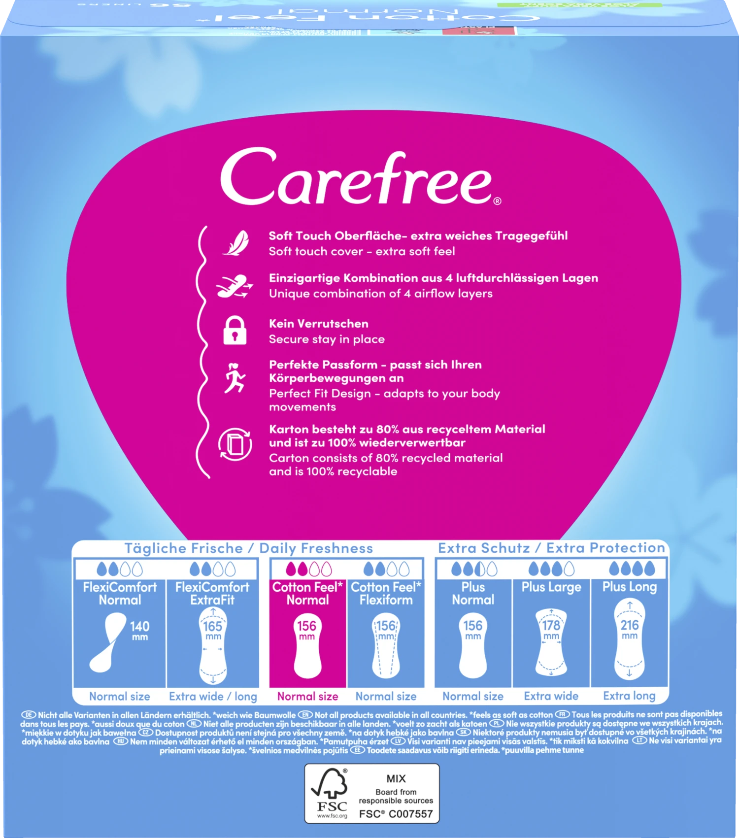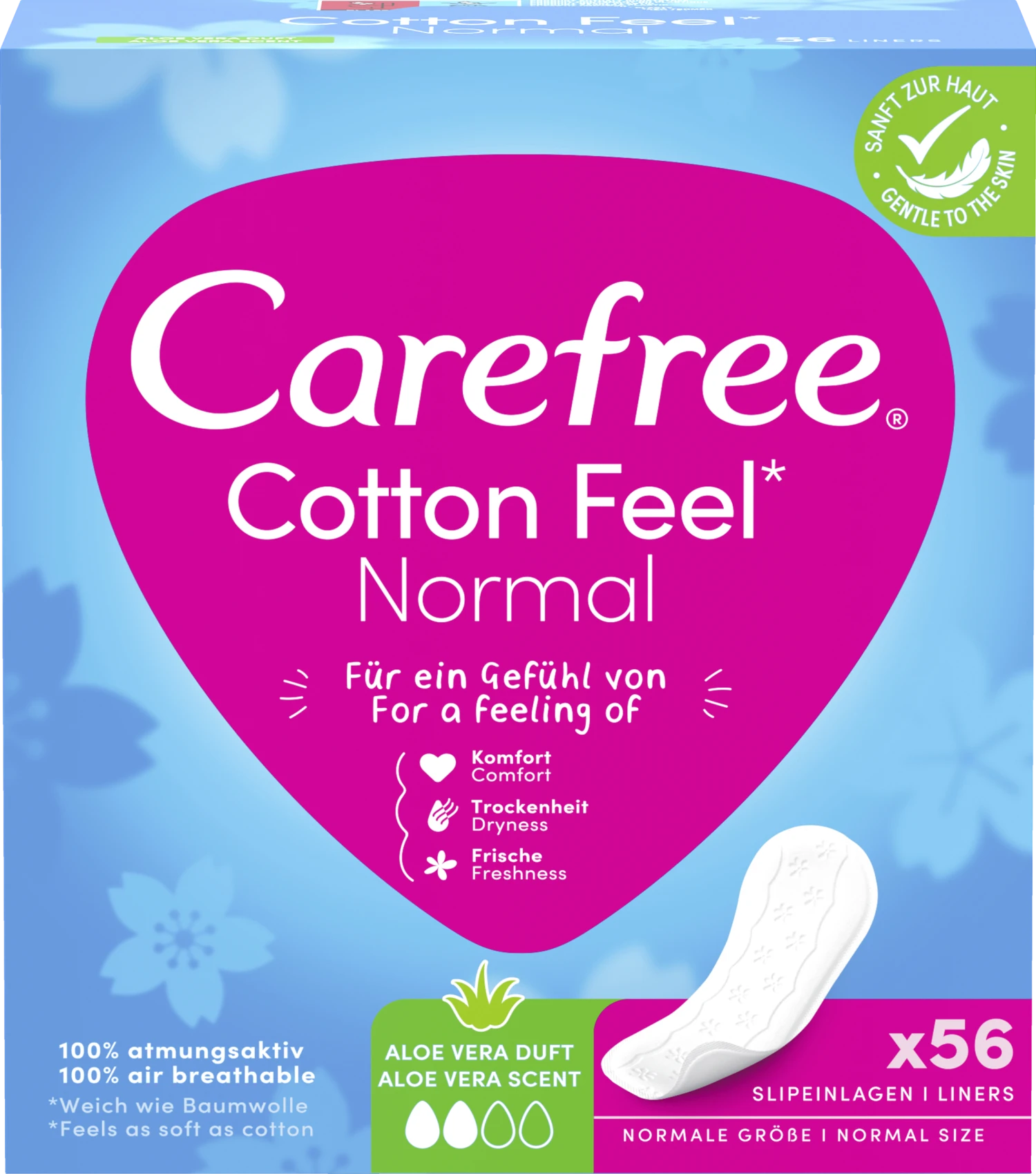 Neues Design: Die Carefree Slipeinlagen Cotton Feel Normal mit Aloe Vera Duft sind zu 100% atmungsaktiv und verleihen ein Gefühl von Komfort, Trockenheit und Frische. Zudem sind sie so weich wie Baumwolle. Die Soft Touch Oberfläche bietet ein extra weiches Tragegefühl und die perfekte Passform passt sich den Körperbewegungen an. Darüber hinaus ist die extra weiche Oberfläche dermatologisch getestet.