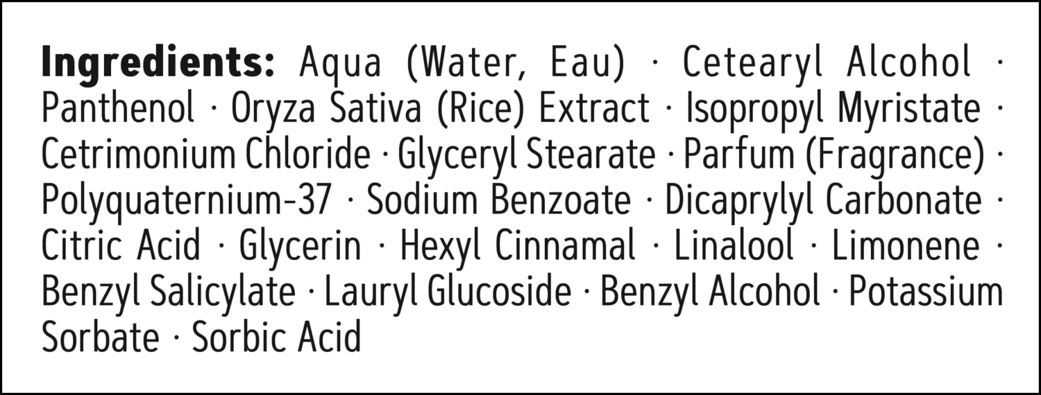 Aqua (Water, Eau), Cetearyl Alcohol, Panthenol, Oryza Sativa (Rice) Extract, Isopropyl Myristate, Cetrimonium Chloride, Glyceryl Stearate, Parfum (Fragrance), Polyquaternium-37, Sodium Benzoate, Dicaprylyl Carbonate, Citric Acid, Glycerin, Hexyl Cinnamal, Linalool, Limonene, Benzyl Salicylate, Lauryl Glucoside, Benzyl Alcohol, Potassium Sorbate, Sorbic Acid