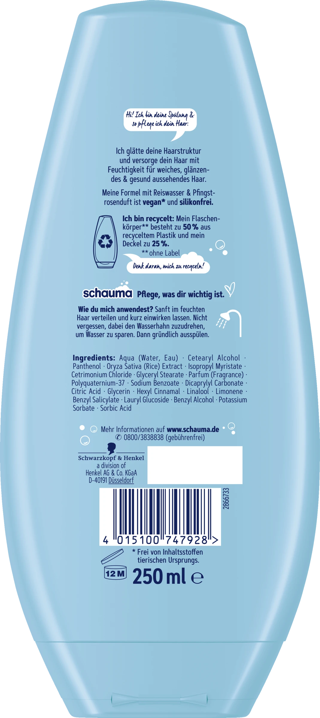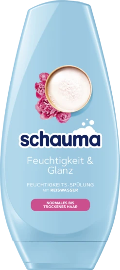 SCHAUMA Feuchtigkeit & Glanz Feuchtigkeits-Spülung mit Reiswasser für normales bis trockenes Haar. Die Spülung glättet die Haarstruktur und versorgt das Haar mit Feuchtigkeit für weiches, glänzendes & gesund aussehendes Haar. Die Formel mit Reiswasser und Pfingstrosenduft ist vegan* und silikonfrei. Der Flaschenkörper** besteht zu 50% aus recyceltem Plastik und mein Deckel zu 25%.
