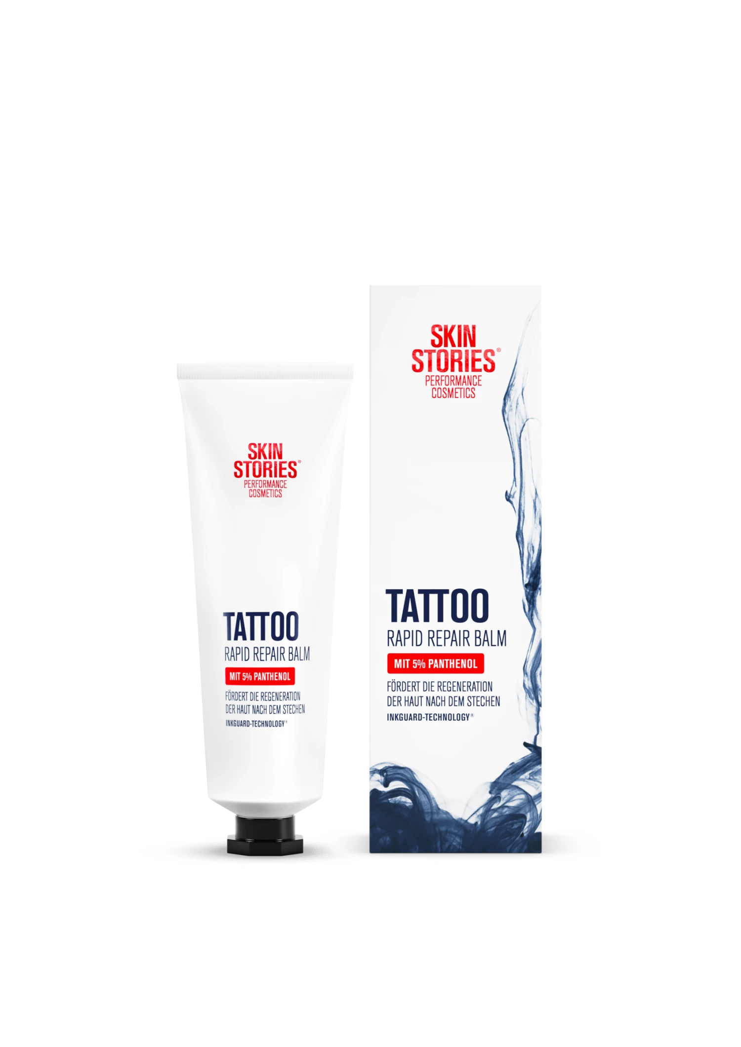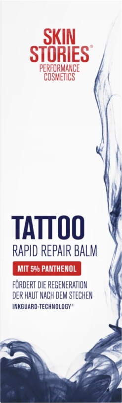 SKIN STORIES Rapid Repair Balm – hautberuhigender Balsam zur Förderung der natürlichen Regeneration. Der SKIN STORIES Rapid Repair Balm beruhigt die Haut nach dem Besuch im Tattoo-Studio. Die Formel mit InkGuard-Technology enthält BerryFlux Vita, um die Hautstruktur zu stärken sowie Panthenol und Vitamin E, die den Regenerationsprozess unterstützen. Außerdem trägt der Balsam zur Linderung unangenehmer Symptome wie Spannungsgefühle bei. Der Rapid Repair Balm ist parfümfrei und nicht fettend, leicht verteilbar und zieht schnell ein. Die Hautverträglichkeit auf tätowierter Haut ist dermatologisch bestätigt – für jeden Hauttyp.