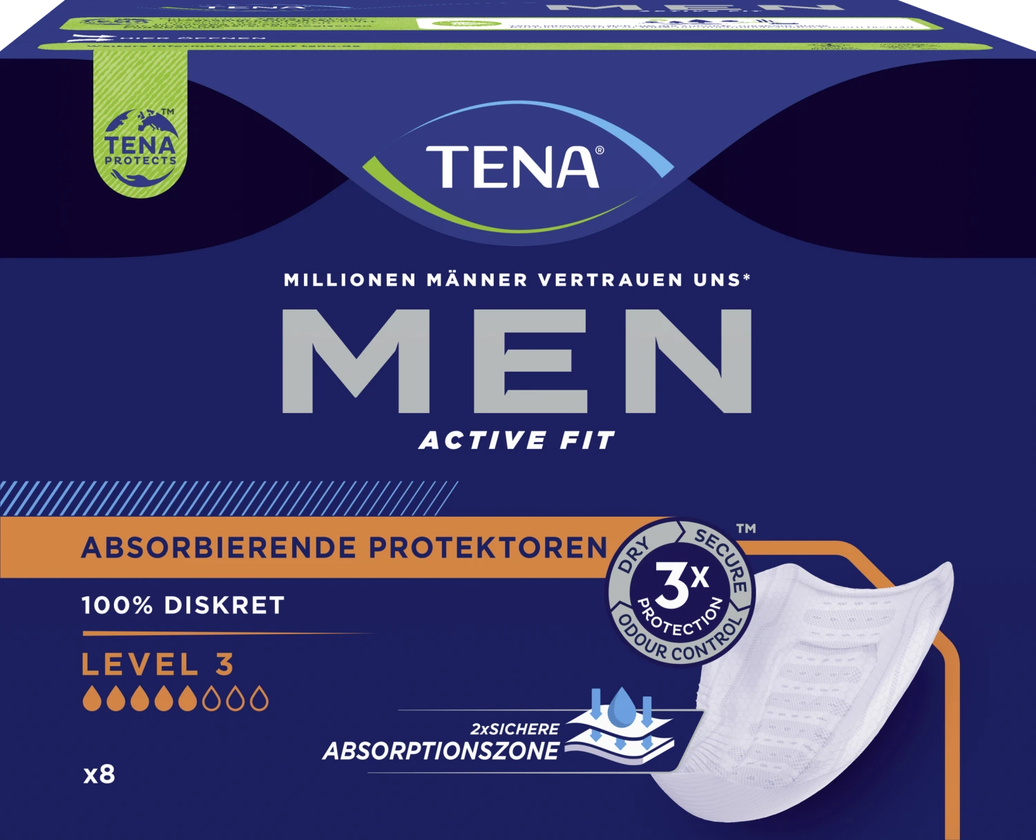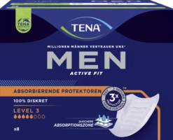 Tena Men Absorbierende Protektoren Einlagen Level 3 mit Absorptions-Kontrolle, schützen bei unfreiwilligem Harnverlust größerer Mengen und sind auch für die Nacht geeignet.